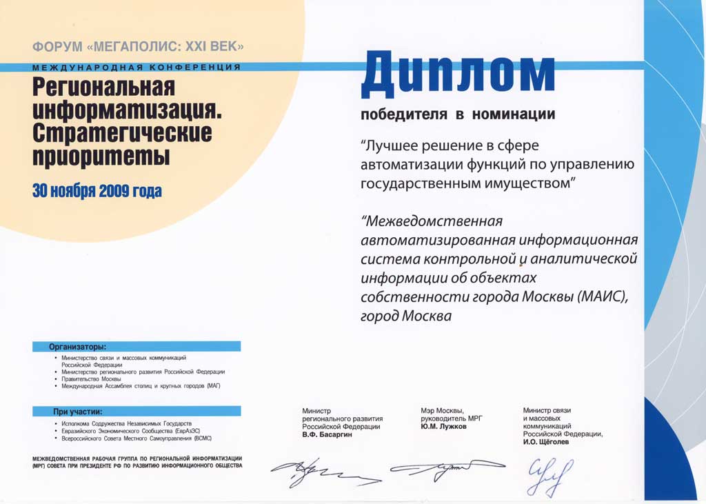 – «Лучшее решение в сфере автоматизации функций по управлению государственным имуществом»: межведомственная автоматизированная информационная система на базе Департамента имущества города Москвы (МАИС).