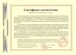 Certificate of Conformity N POCC RU.OOO1.04БТ00.00065, of December 16, 2002 of the State Standardization Committee (Gosstandart) of Russia confirms the compliance of the General Financial Accountability of the Bank II (OFO-Bank II v.3.0) with the GOST (Russian national state standards) requirements and applicable regulatory instruments of the Bank of Russia and the Russian Federation's Finance Ministry.